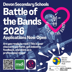 Devon Music Education Hub is thrilled to present the Devon Secondary Schools Battle of the Bands 2026! Aspiring young bands from secondary schools and settings across Devon, Plymouth, and Torbay are invited to apply for a place in one of our regional heats. Each band will receive performance feedback from music industry professionals, with selected groups progressing to the final at Exeter Phoenix on Tuesday 10 March 2026.